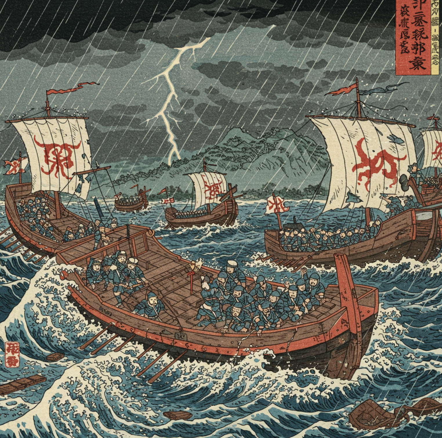 그러나 예상치 못한 일이 벌어졌습니다. 일본 본토로 진격을 준비하던 몽골군의 함대가 강력한 태풍을 만났고, 수많은 배가 침몰했습니다. 전투력의 대부분을 잃은 몽골군은 결국 철수할 수밖에 없었습니다. 일본인들은 이 태풍을 ‘신이 보낸 바람’이라 여겼고, 이후 ‘가미카제(神風)’라는 개념이 형성되었습니다.