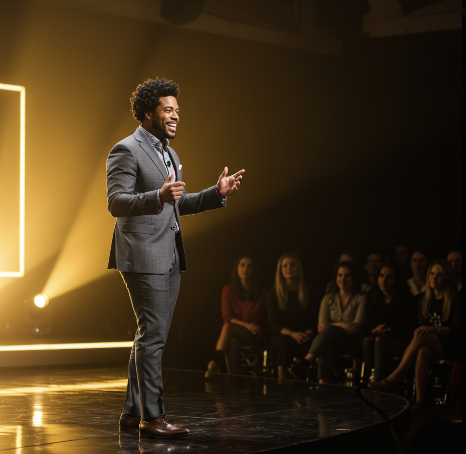 청중을 사로잡는 스피치를 하고 있는 카리스마 넘치는 강연자