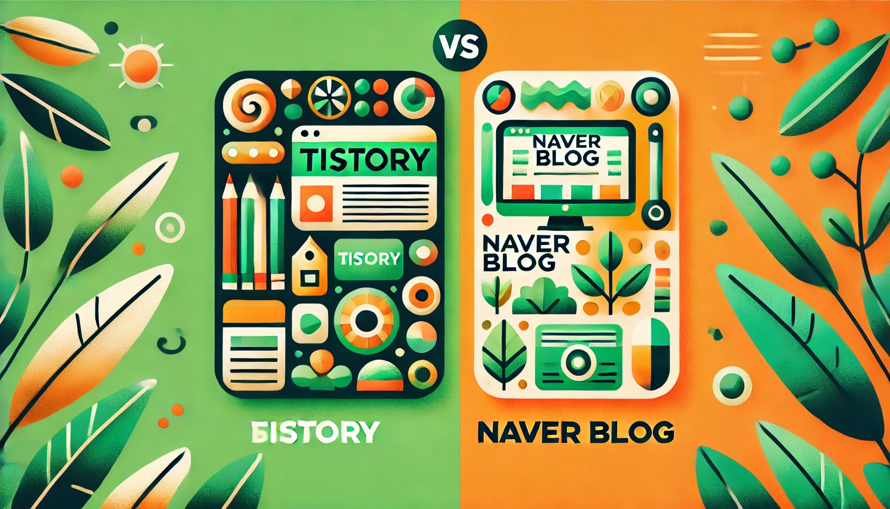 티스토리와 네이버 블로그의 차이점을 비교한 메인 이미지. 왼쪽은 심플하고 모던한 티스토리의 오렌지 톤, 오른쪽은 밝고 커뮤니티 중심의 네이버 블로그의 그린 톤으로 각각의 특징을 명확히 나타내고 있다