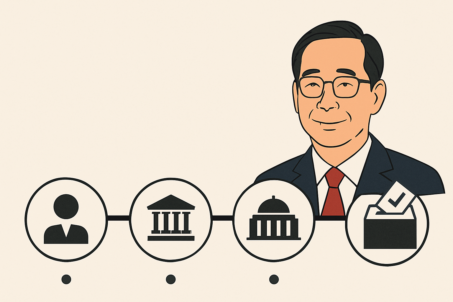 한덕수의 정치 인생을 상징하는 아이콘 중심 타임라인 일러스트