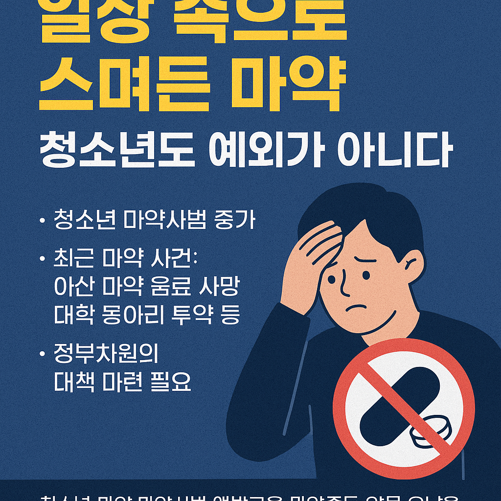 이제 마약은 더 이상 어른들만의 문제가 아닙니다. 학생, 청소년, 일반인 누구든 SNS를 통해 쉽게 접근 가능한 시대가 되었고, 마약 가격은 낮아져 ‘한 번쯤’의 호기심에 손을 대기 쉬운 환경이 되어버렸습니다.