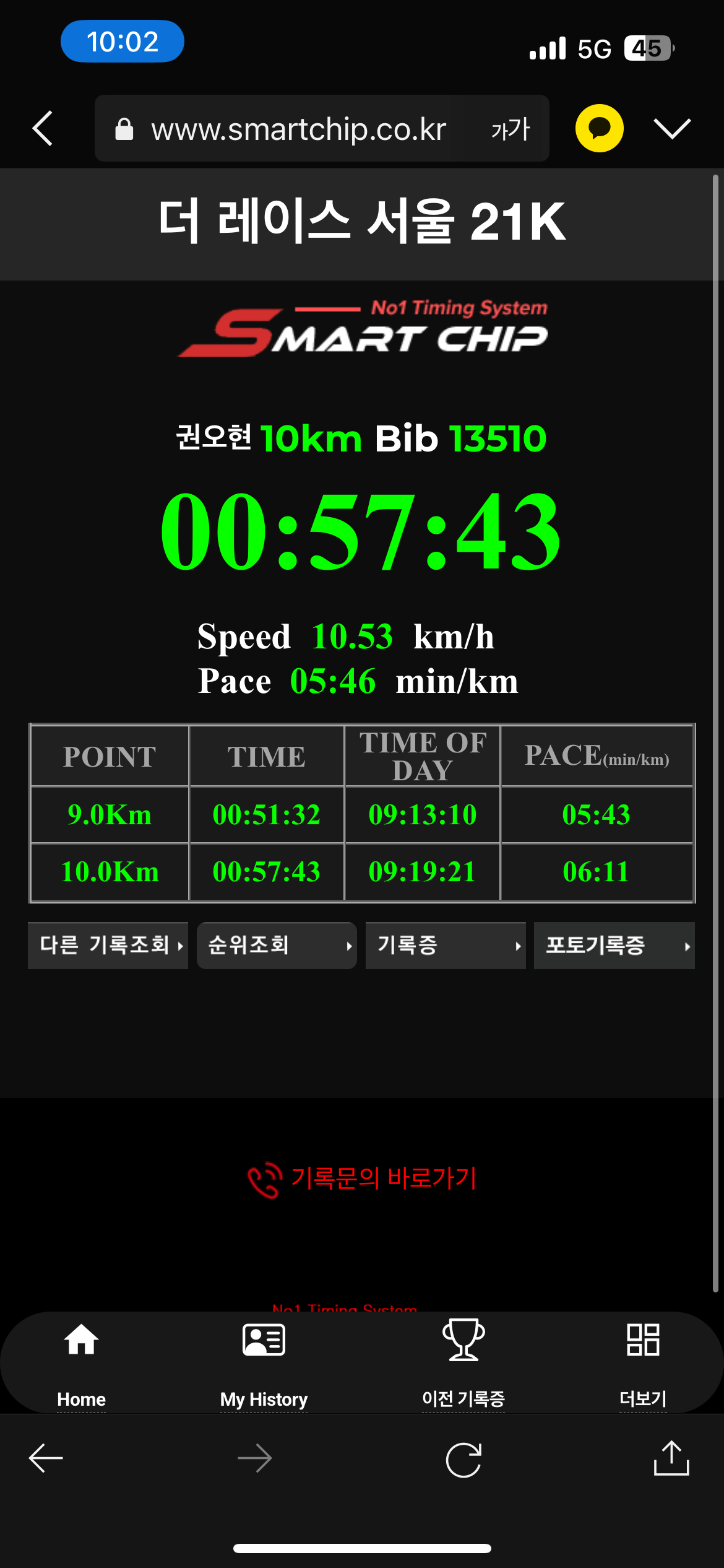 거의 2년만인데 긴장도 되었지만 목표했던 1시간 이내 완주를 성공했습니다.